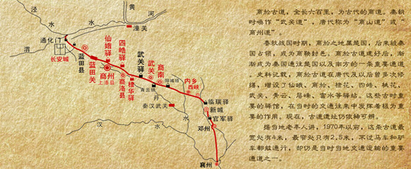 商於古道,為古代的軍事、政治、商賈之道,其歷史可追溯到春秋戰(zhàn)國時期。該古道由陜西省商洛市(古時亦稱上洛郡、上洛侯國、洛州、“商州”)通往河南省內(nèi)鄉(xiāng)縣柒於鎮(zhèn),全長約六百里。